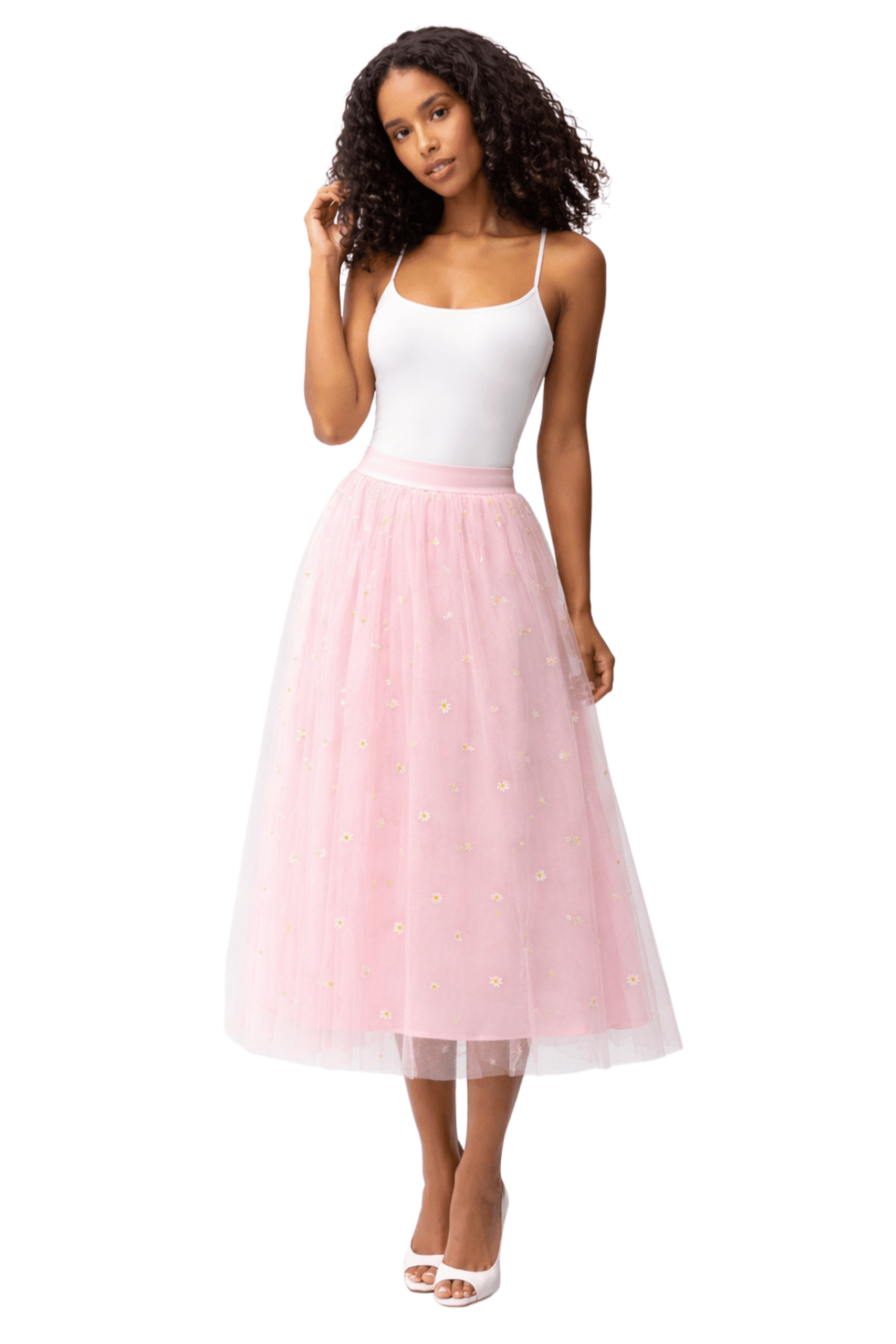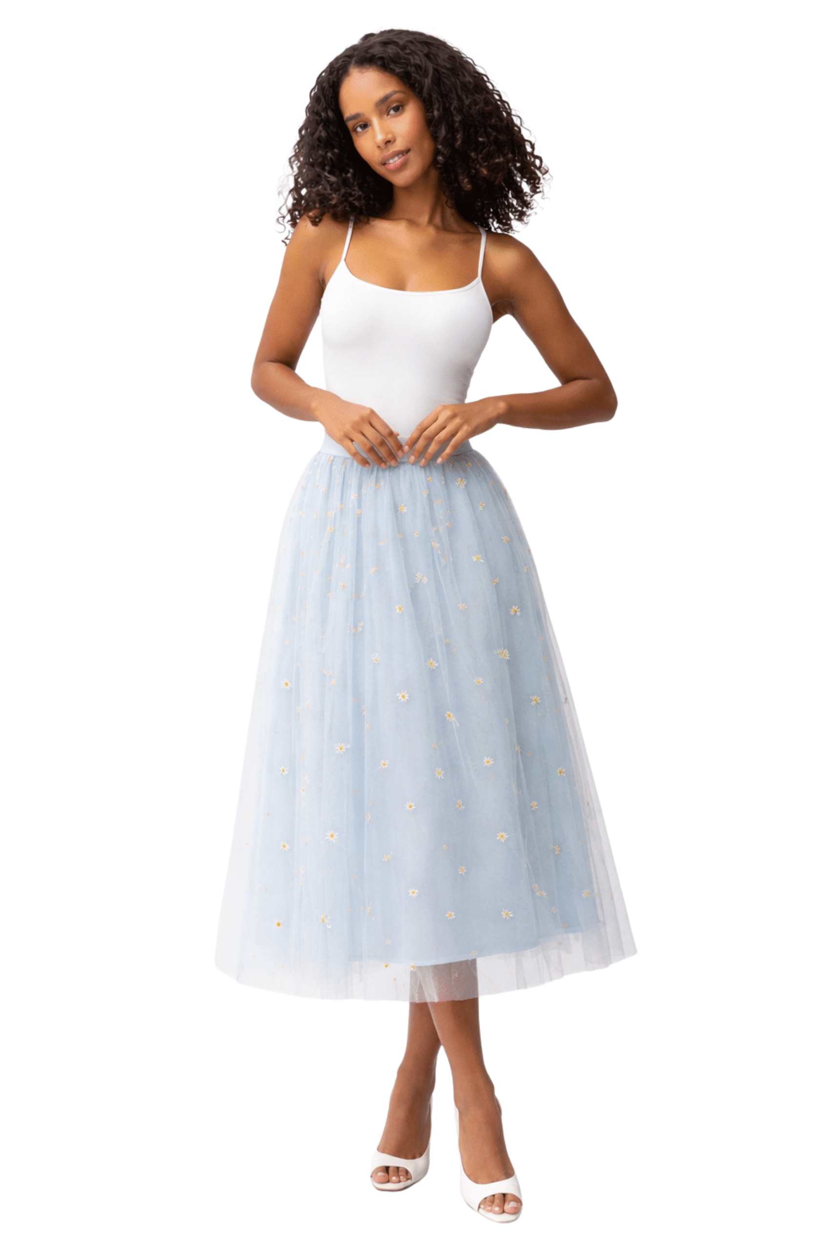 Falda vaporosa de inspiración floral, confeccionada con capas suaves que aportan volumen y movimiento natural. Su encanto principal son los delicados detalles de flores tipo margaritas, que decoran la prenda con un aire alegre, femenino y primaveral. Perfecta para mujeres que buscan frescura, dulzura y estilo en una sola pieza, ideal para días soleados, paseos o eventos casuales con un toque romántico.